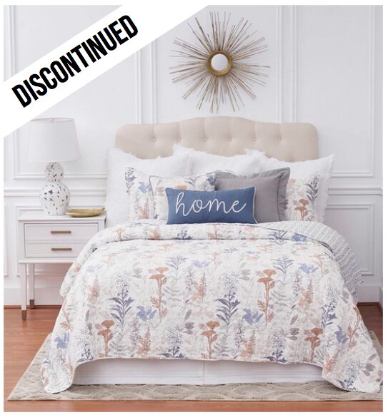 The Lina Quilt Set has leaves, floral cuttings and botanicals in a watercolor-inspired artistic print. The combination of colors: rusty and terracota, shades of taupe and brown, smoky greys and blues on a creamy background make this such a pleasant and calming pattern. This quilt would be a show stopper in a neutral bedroom, adding interest without being intrusive. We rarely flip through the bed at the store without a comment about how pretty it is. Lina reverses to a pretty print that looks like hand stamped chevron in the smoky blue that is also on the front of the bed. Crafted of cotton and machine washable for easy care.